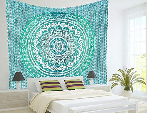 Popular Handicrafts Kp652 Blå ombre hippie mandala bohemisk psykedelisk gobeläng väggkonst etnisk sovsal dekor indiskt överkast magiskt tänkande gobeläng 215 x 230 cm (84 x 90 tum)