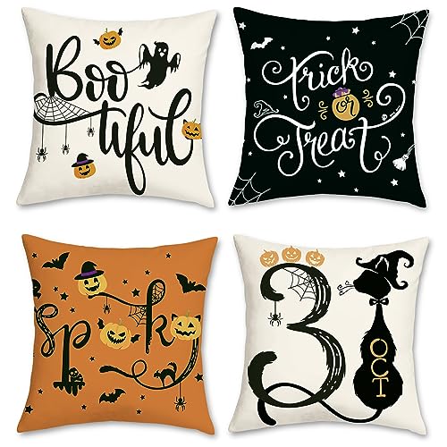 Bonhause Spooky Halloween kuddfodral 45 x 45 cm bus eller godis orange svart dekorativa kuddöverdrag mjuk sammet örngott för bäddsoffa hem trädgård halloween dekor set med 4