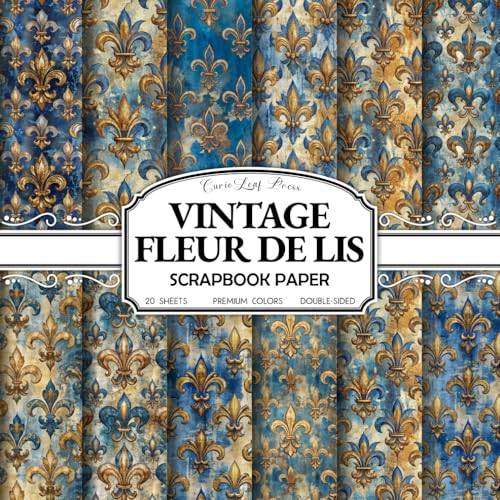 Vintage Fleur de Lis Scrapbook Paper: 20 Double-Sided 8.5 x 8.5 Sheets with Antique Blue and Gold Heraldry and Damask Textures for Junk Journals, Decoupage, Collage & Card Making