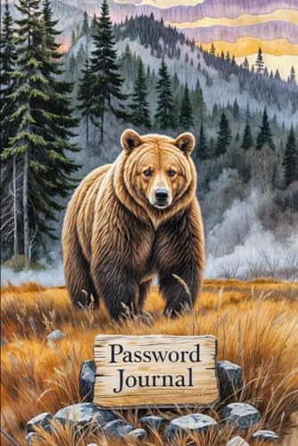 Password Journal with Brown Bear in Golden Grass Field – Artistic Wildlife Cover for Men & Outdoor Enthusiasts – Large Print A–Z Organizer with Security Tips