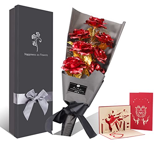 Fontee Guldros blombukett, guldfolie konstgjord rosbukett med presentask, bästa romantiska presenten idealisk för henne på alla hjärtans dag, mors dag, årsdag, födelsedag, jul, dekoration (röd)