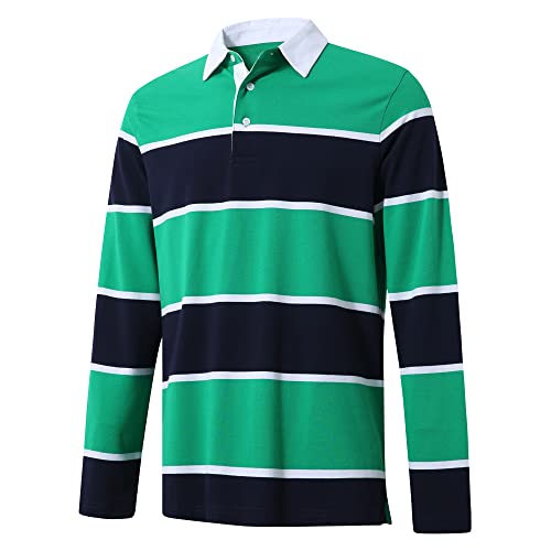 Men's Long Sleeve Polo Shirt Casual Collared Striped Pique Polo Shirts Soft Cotton Dry Fit Golf Polo Shirts for Men, L Navy Green