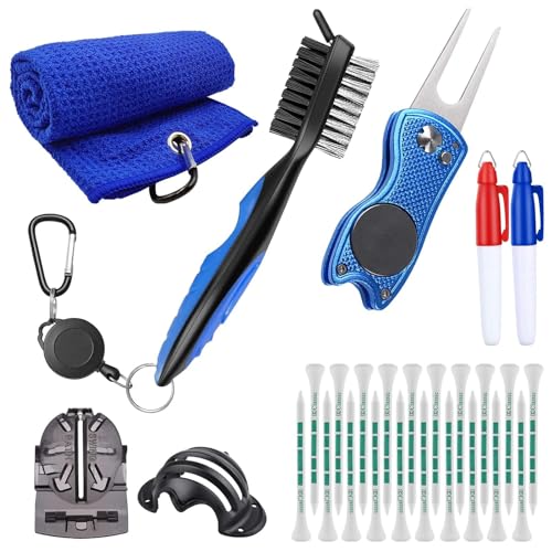 Yumzeco golfklubbsrengöringskit, golfklubbsspårrengöringsborste, mikrofiber-golfhandduk, 20 st golfpeggar, divotverktyg, golfbollslinjemarkörverktyg, golfbollsmarkörpenna