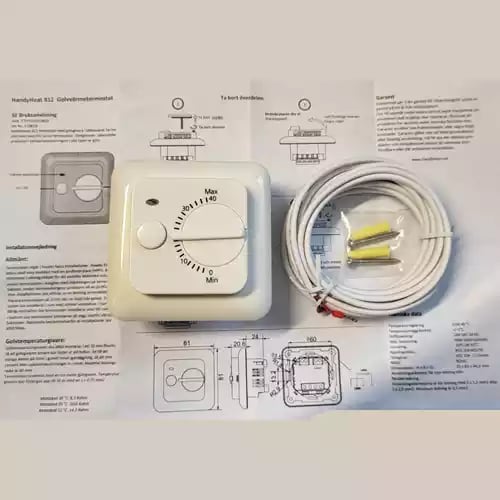 Termostat Manuell termostat, HH 812-F. Enkel att använda. Golvgivare ingår. IP21. 16 A. Eljo-ram. Max 3600 Watt. 230 AC. Elfenbensvit.