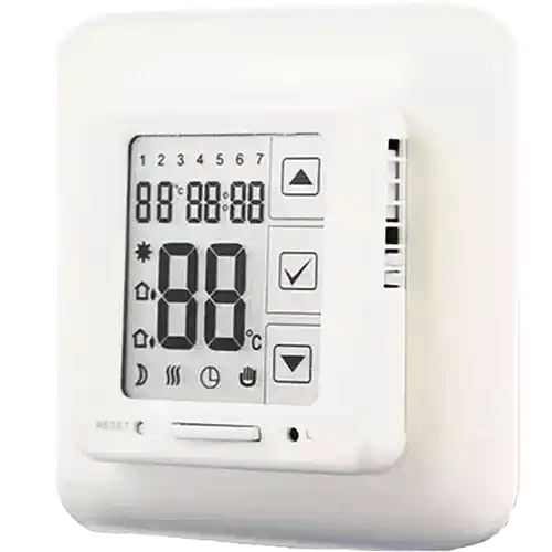 Termostat Digital LCD-display | HH 822-F. Enkel att använda. Golvgivare ingår IP21. 16 A. Eljo-ram. Max 3600 Watt. 230 AC. Vit bakgrundsbelysning.