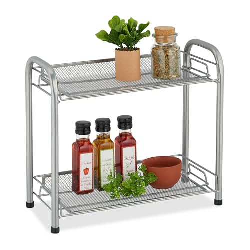 Relaxdays Kryddhylla, 2 nivåer, bordshylla för kök och badrum, kryddor, golvhylla av metall, silver