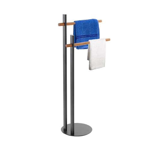 Avilia Elegant Avilia Home Golv Handdukshållare - Svart Metall och Bambu Beige | Badrum Golvlampa med 2 Krokar | Badrumsorganisation och stil