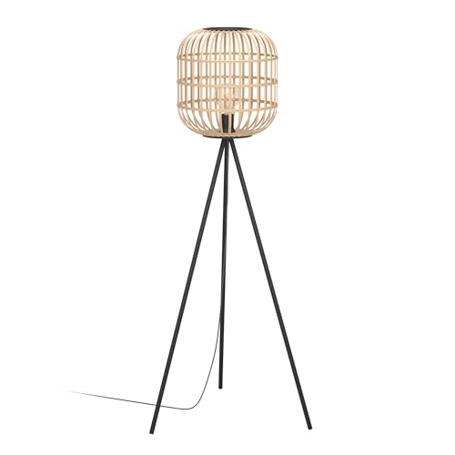 EGLO golvlampa Bordesley, 1-lågig golvlampa vintage, natur, boho, hygge, stående lampa i svart stål och trä i naturliga färger, vardagsrumslampa, lampa med fotströmbrytare, E27-sockel
