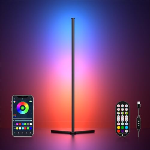 NIKYJM LED-vinkellampa, RGB-golvlampa 145 cm RGB LED-golvlampa, vinkellampa med APP-kontroll och fjärrkontroll, 16 miljoner färger och 300 lägen, synkmusik för sovrum vardagsrum