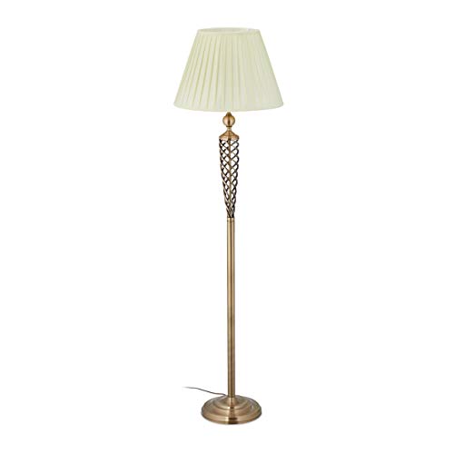 Relaxdays Golvlampa antik, tygskärm, dekorativ metallfot, E27, golvlampa vardagsrum, H x D: 157 x 42 cm, mässing/vit