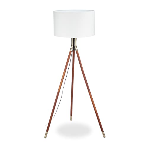 Relaxdays, vit/brun golvlampa vardagsrum, 3 träben, ram med mässingsfinish, tygskärm 48 cm Ø, 150 cm hög, standard, 10024804