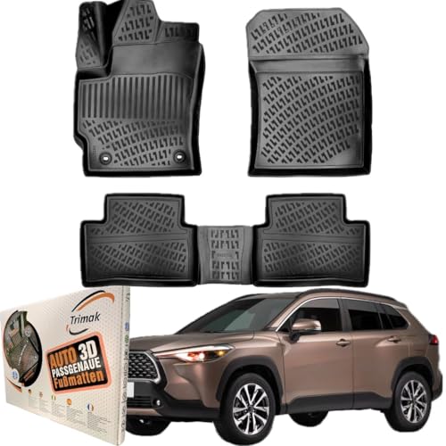 Trimak Perfekt passform 3D-golvmattor bil kompatibel med Toyota Corolla Cross från 2020 biltillbehör 1:a och 2. Gummimattor bilar TPE allväder luktfri halkfri fram och bak svart