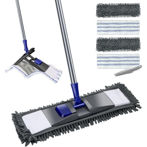 MASTERTOP Golvmopp i mikrofiber, platt golvmopp med 4 tvättbara chenille- och mikrofiberpåfyllningsdynor, våt torr mopp för trälaminat vinylkakel golvrengöring – skicka 1 skrapa