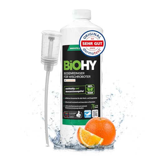 BiOHY Golvrengöringsmedel för mopprobotar med apelsindoft (1l flaska) + doser | Rengöringsmedel koncentrat för alla mopprobotar | Skumfritt & Streckfritt | Hållbart 1:200 koncentrat (Wischroboter