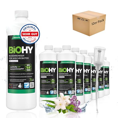 BiOHY Golvrengöringsmedel för mopprobotar med fräsch vårdoft (12 x 1l flaska) + doser | Rengöringsmedel koncentrat för alla mopprobotar | Skumfritt & Streckfritt | Hållbart 1:200 koncentrat