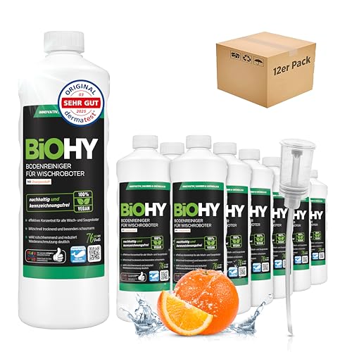 BiOHY Golvrengöringsmedel för mopprobotar med apelsindoft (12 x 1l flaska) + doser | Rengöringsmedel koncentrat för alla mopprobotar | Skumfritt & Streckfritt | Hållbart 1:200 koncentrat (Wischroboter