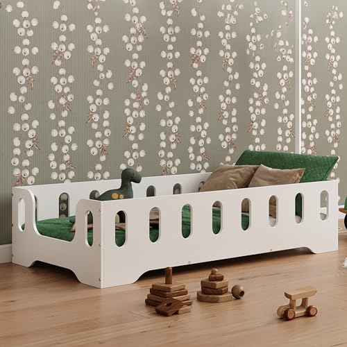 smartwood Golvsäng 70x140 Vit - Montessori Barnsäng i trä med FSC-certifikat - TILA 2B med fallskydd och ribbotten, belastningsbar upp till 230 kg - Enkel montering
