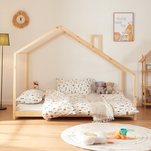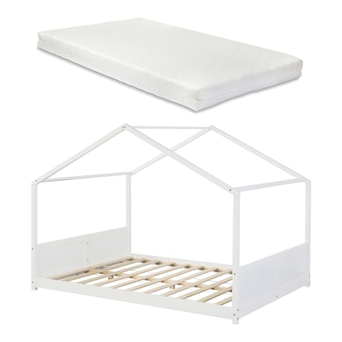 STARTOGOO Hus 90x200 pojkar och flickor barn i massivt trä konvertibel golvsäng med vit ribbotten, enkel