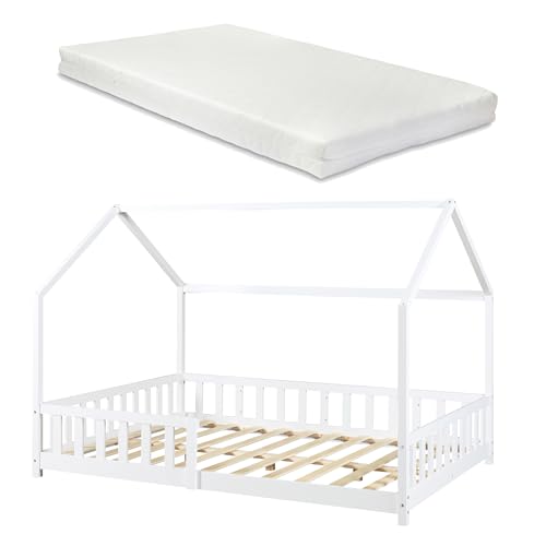 [en.casa] Barnsäng, hesel, hussäng med madrass, 90 x 200 cm, vit, med fallskydd, och ribbotten, Montessori, golvsäng, ungdomssäng, träsäng