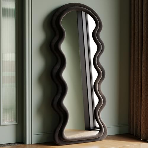 Asymmetrisk vågig spegel, stor golvspegel, helkroppsspegel, väggspegel, spegel med flanellindad träram, hängande eller lutande (svart, 160 x 60 cm)