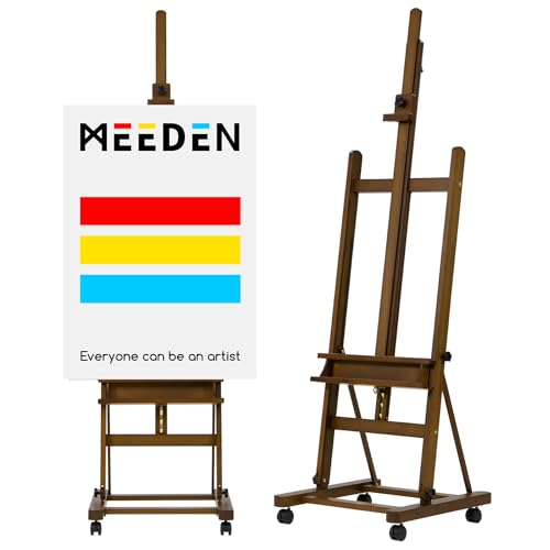 MEEDEN H Ramstaffli stativ för målning, justerbart golvstaffli för ritning och display, slitstark bokträ håller duk upp till 368 cm – 4 hjul och förvaringsbricka