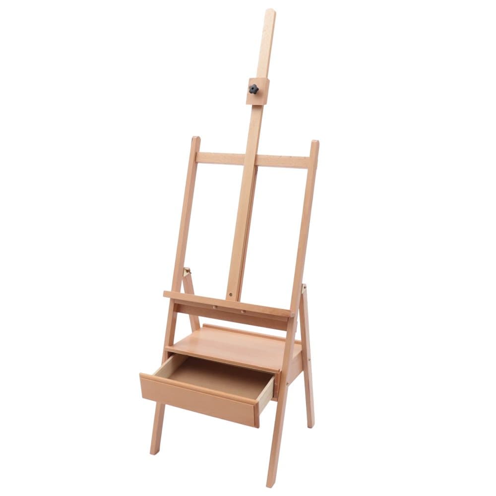 FANTASK Staffli med hylla och låda 71 x 114 x 180 cm, konstnärstaffli av bokträ, justerbart golvstaffli för dukar upp till 86 cm