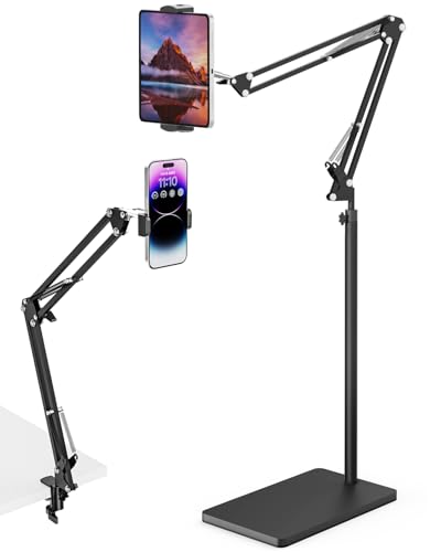 CAMOLO Golvstativ för surfplatta med dubbel viktbas, telefonhållare över sängen, höjdjusterbar arm, stretchig stativhållare, kompatibel med iPad mini Air Pro, Kindle, Switch, mobiltelefoner