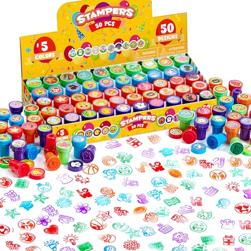 JOYIN 50 st blandade frimärken för barn – självbläckstämplar med 50 mönster för födelsedagsfestgåva, karnevalspriser, skolstämplar, goodie-väska, halloween, jul (zoo, semesterstämplar)
