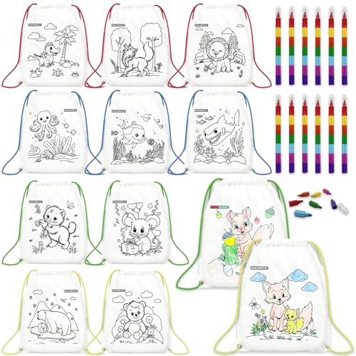 HahaMagic 12 PCS färgglada dragsko ryggsäck för barn med 12 stapelbara kritor (7 färger i en), lämplig som returgåvor, födelsedag goodie bags och konst party favor väskor