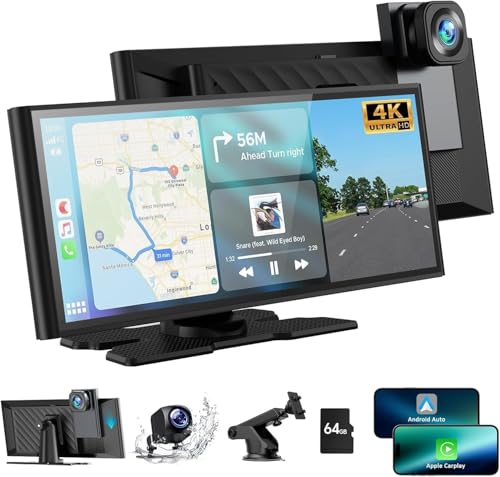 Rimoody Wireless Apple Carplay Android bärbar bilradio, 10,26 tum IPS trådlös bildskärm bilradio med Bluetooth/FM-radiosändare/röstkontroll/Google/Siri/AUX/64G TF-kort för 7-32 V bil
