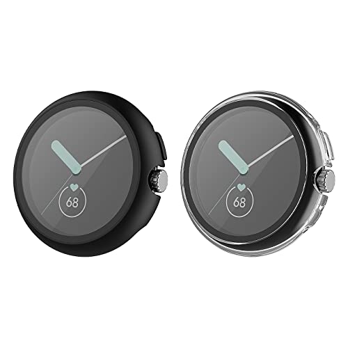 MoKo 2 Pack Hard PC Case Compatible with Google Pixel Watch 2/Pixel Watch with Tempered Glass Screen Protector, Ultra-Thin Protective Case Overall Cover, Black/Clear