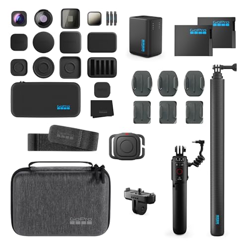GoPro HERO13 Black Ultimat Tillbehörspaket: HB-objektiv, 2,7 m förlängningsstång, vattentät fjärrkontroll, Contacto, dubbel laddare, 2 Enduro-batterier, Volta, fästen & Casey-fodral.
