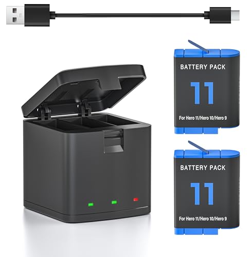 CITYORK Uppgraderad batteriladdare set för GoPro Hero 12/11/10/9 sportkamera batteriladdare, 2 000 mAh batteri (2-pack) och 3-kortplatser, med LCD-skärm och USB-kabel