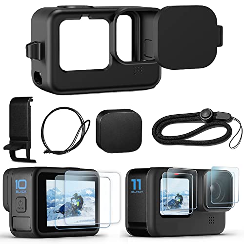 OKFUN Tillbehörssats för GoPro Hero 11/10/9 svart, silikonfodral skyddsfodral med gummilinsskydd + skärmskydd + batterisidoskydd + linsskydd för Go Pro Hero11 Hero10 Hero9