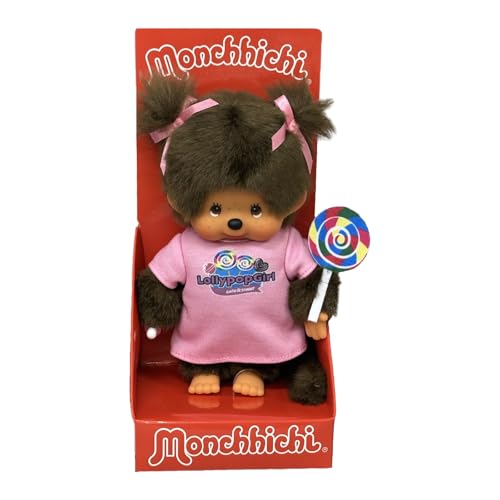 Sekiguchi 205257 – Original Monchhichi-flicka med rosa klänning och färgglad klubba, ca 20 cm stort gosedjur av brun plysch