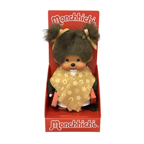 Sekiguchi 203895 – Original Monchhichi-flicka med hängselklänning och kattansikte, ca 20 cm stort gosedjur av brun plysch