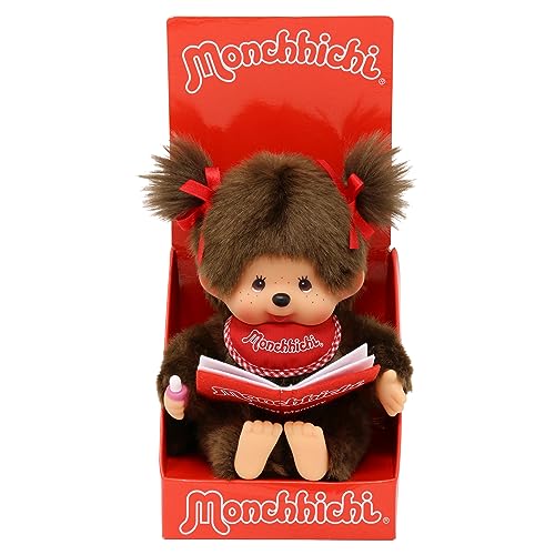 Sekiguchi 221561 – Original Monchhichi-flicka, plyschdjur med fotoalbum och rosetter, ca 20 cm stort gosedjur av brun plysch
