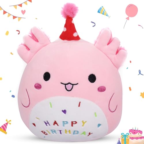 Happy Birthday-plyschdjur, 23 cm födelsedag, gosedjur, plyschdjur, Kawaii Axolotl, gosedjur, mjukisdjur, flicka, rosa salamandrgosedjur, Axolotl, plyschkudde, leksak för flickor, födelsedag