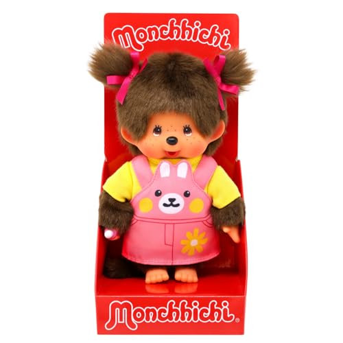 Sekiguchi 203888 – Original Monchhichi-flicka med hängselklänning och kaninansikte, ca 20 cm stort gosedjur av brun plysch