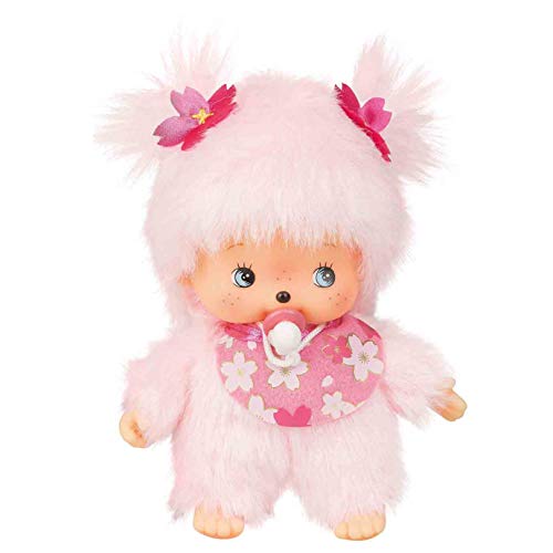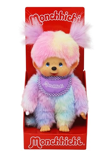 Sekiguchi 242153 – Original Monchhichi-flicka, plyschfigur med haklappar och flätor, ca 20 cm stort gosedjur av färgglad plysch