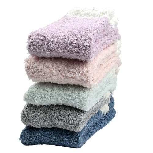 Hocerlu 5 par fluffiga gosiga strumpor för kvinnor – premium tjocka vintervarma sängstrumpor, termo, hög elasticitet, supermjuka, inget spillt fluff, EU-storlek 35–41, Grön rosa violett grå blå, 35-41