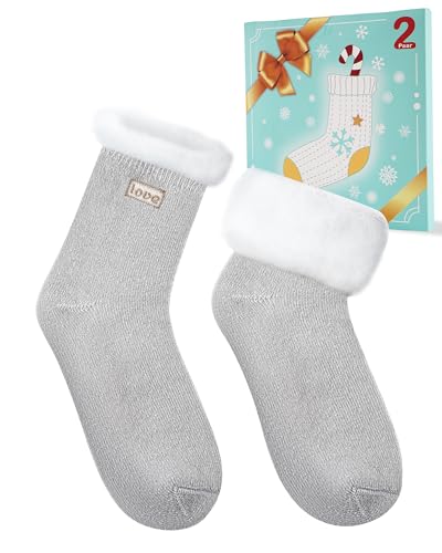 SukModen Gosiga strumpor dam varma termostrumpor, fluffiga ullstrumpor tjocka vinterstrumpor andas husstrumpor, presenter till kvinnor julstrumpor 2 par storlek 36–42 med presentförpackning, GRÅ, 36