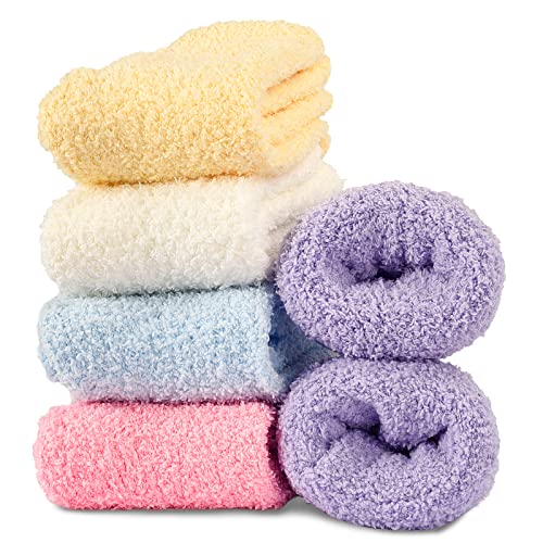 Hocerlu 5 par fluffiga gosiga strumpor för kvinnor – premium tjocka vintervarma sängstrumpor, termo, hög elasticitet, supermjuka, inget spillt ludd, Gul vit blå rosa violett, 35-41 EU