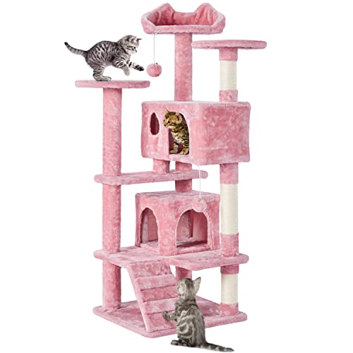 Yaheetech Kattträd plysch kattmöbel med 2 gosiga grotta 139 cm lekträd för katter, rosa