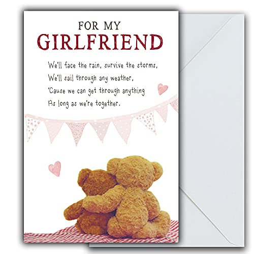 Snuggly Bumpkins födelsedagskort till flickvän, "For my Girlfriend, We'll Face the Rain, Survive the Storms.." Två söta gosiga teddies, 159 x 235 mm, röd och vit