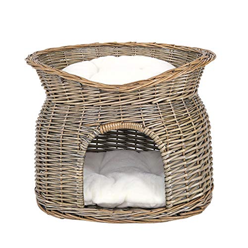 lionto Korg i pil för katter och små hundar med 2 mjuka kuddar, 55x39x43 cm, mysig kattskorg i miljövänligt pilträ, modern katthåla med vita gosiga kuddar, grå