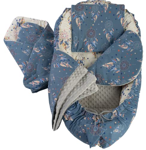 Medi Partners set med 5 delar, babybo, 100 x 60 x 15, avtagbar insats, säng, gosigt bo krypfilt för spädbarn, nyfödda, 100% bomull (drömfångare med grå minky)