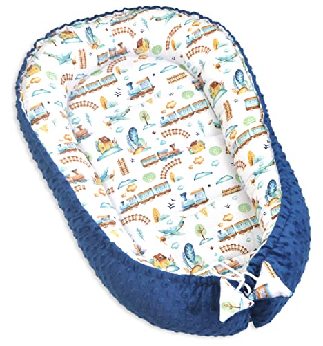 Pimko Babynest, 2-sidigt, minkymaterial, babybädd för bebis, gosigt bo, babykokong för spädbarn och nyfödda, lämpligt för hemmet, 55 x 90 cm (blått tåg)