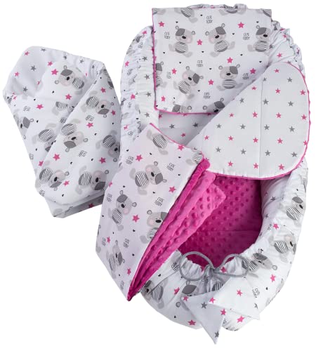 Medi Partners set med 5 delar, babybo, 100 x 60 x 15, avtagbar insats, säng, gosigt bo krypfilt för spädbarn, nyfödda, 100% bomull (nallebjörn med mörkrosa, minky)