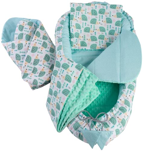 Medi Partners set med 5 delar, babybo, 100 x 60 x 15, avtagbar insats, säng, gosigt bo krypfilt för spädbarn, nyfödda, 100% bomull (igelkott med mint minky)